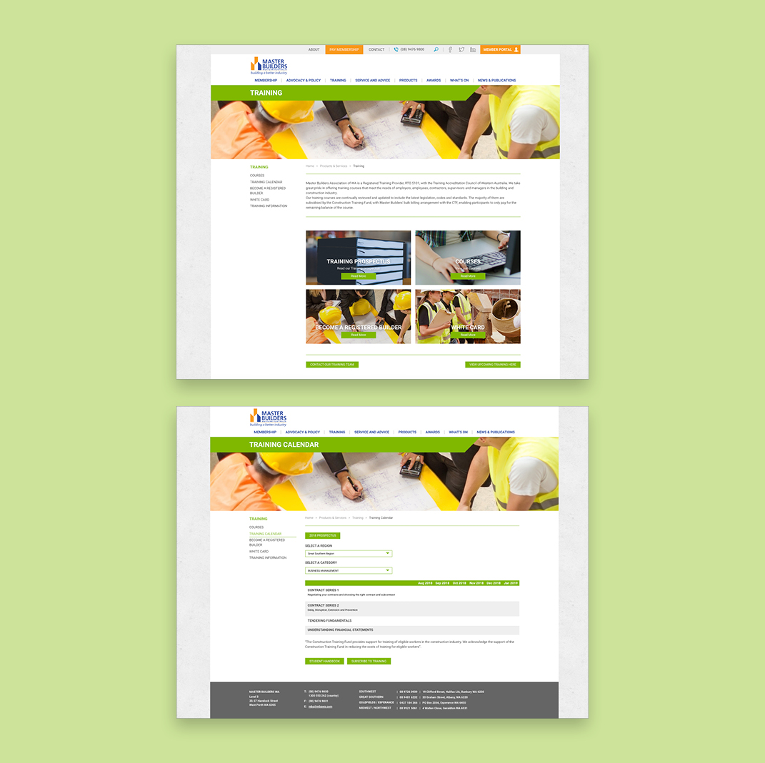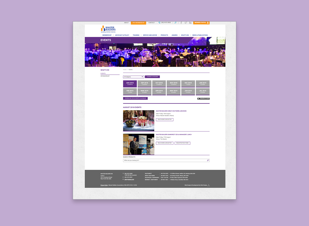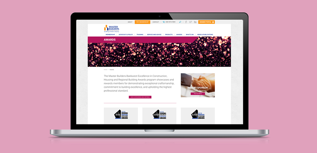 Having worked with Master Builders WA since 2010, we were commissioned to update their website with a focus on Master Builder’s partners and sponsors having a more prominent exposure. The site includes an extensive searchable database of all their members both individual and company; ECommerce for purchasing products online; a members’ portal; an Awards section where businesses can enter online as well an Awards Program; and an Events Calendar for upcoming industry events.